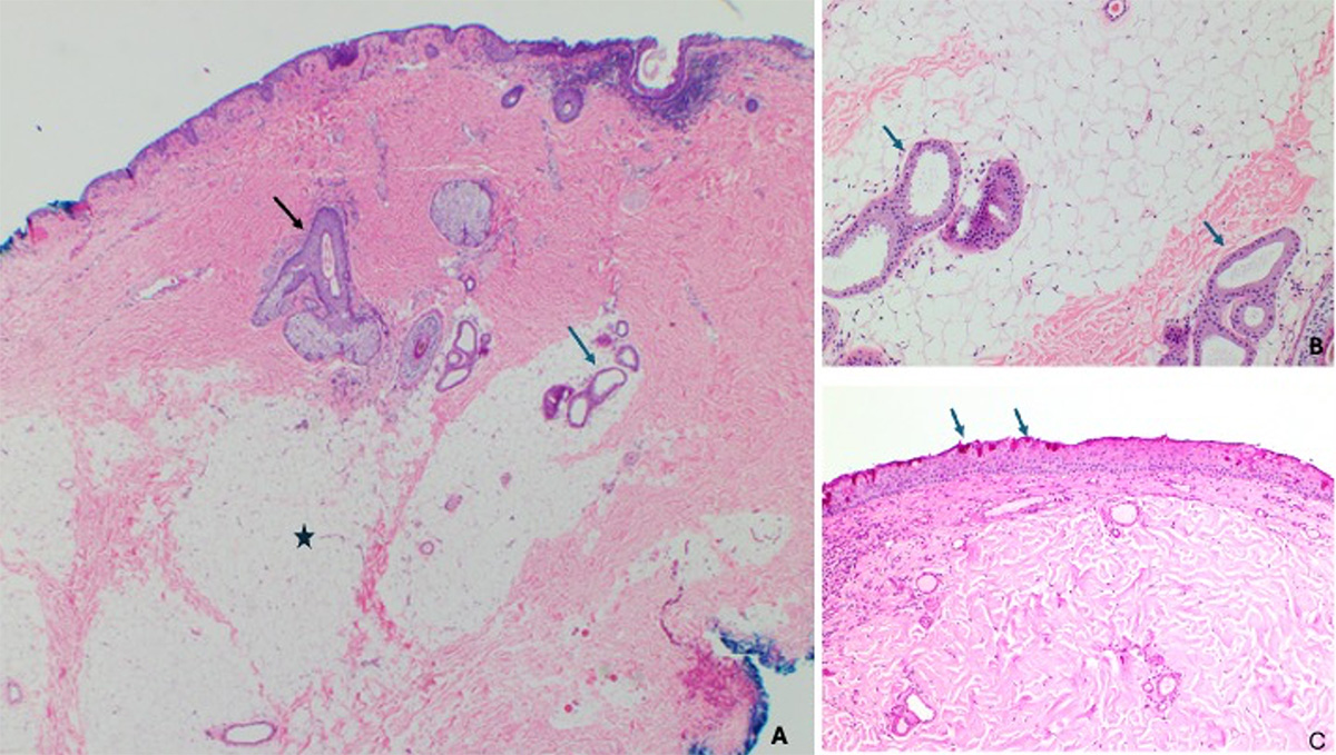 Figure 1. Dermolipoma. A. Epibulbar choristoma composed of dense collagenous stroma covered by conjunctiva-type epithelium. The stroma contains pilosebaceous units (black arrow), sweat glands (blue arrow) and abundant adipose tissue (asterisk). H&E original magnification x 20. B. Lobules of mature adipocytes separated by fibrous septa, intermixed with sweat glands (blue arrows). H&E original magnification x 200. C. Non-keratinized stratified squamous epithelium with PAS-positive goblet cells is covering the lesion. Periodic Acid-Schiff (PAS) original magnification x 100.